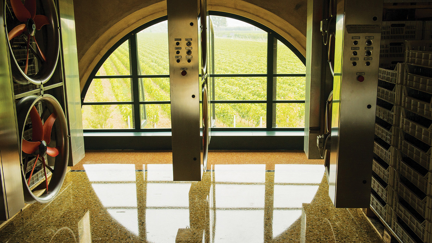 The harvested grapes are brought to the cellar to dry. Here, Romano has developed an original and unique drying system. The drying room has several large fans, placed on sliding tracks, circulating air up and down the stacks of drying grapes. Every fifteen minutes, the fans invert the direction of the airflow to ensure consistency.
